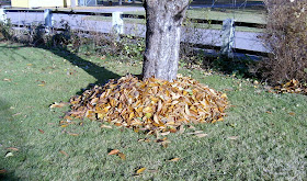 ...... Herreys hade gyllene skor, våra träd har fått gyllene strumpor! Det var en riktig köldknäpp i natt så resterande löv från bigarråträden dalade sakta ner mot marken. Det blev till att räfsa igen, men med ett sånt väder som idag räfsar jag gärna.