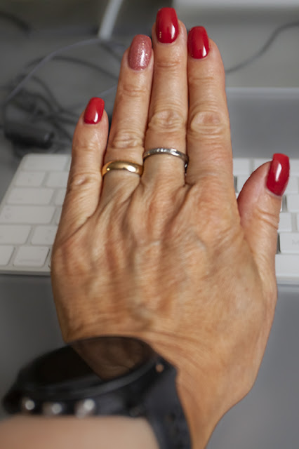 Tur att nagelterapeuten har lite akuttider ;-) Det fick helt enkelt bli mycket kortare naglar i ny form, men samma färg (bortsett från ringfingret).